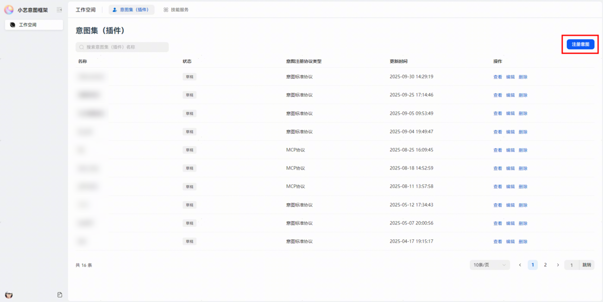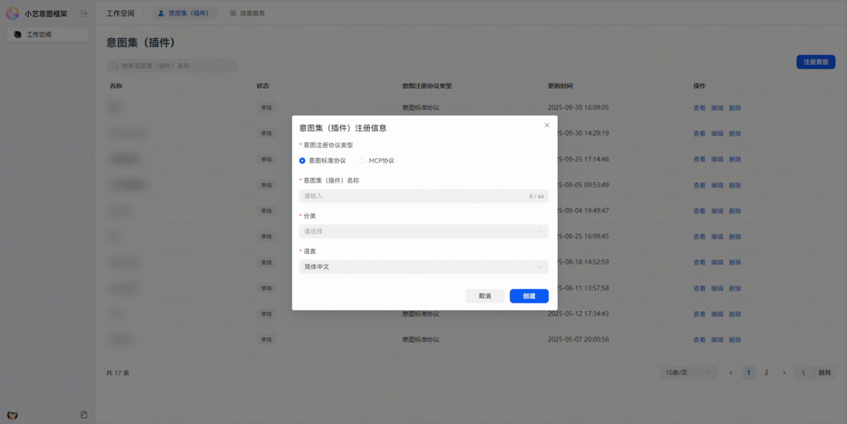 名称 描述 意图注册协议类型 选择意图标准协议。 意图集(插件)名称 需唯一标识。 分类 开发者根据自定义意图选择对应垂域。 -