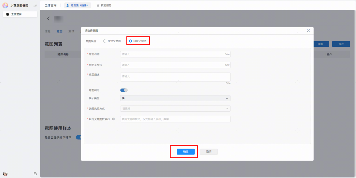选择自定义意图并填入意图信息(根据接入方案进行填入)并确定。