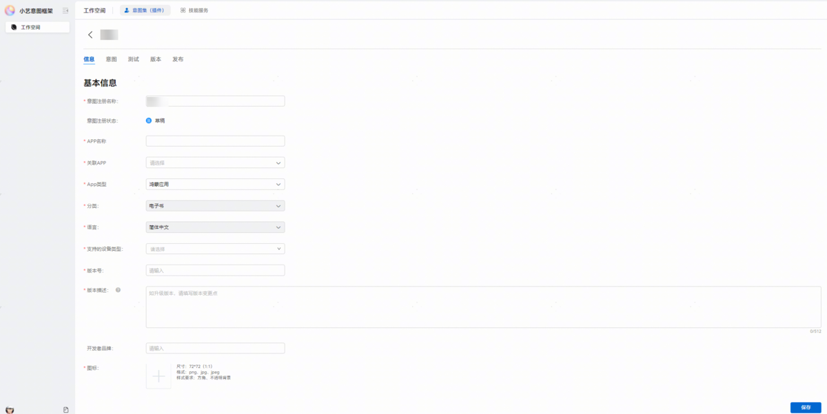 名称 描述 意图注册名称 填写应用名称。 APP名称 填写应用名称。 关联APP 选择需要进行测试的应用。 支持的设备类型 选择手机、平板、PC。 版本号 开发者自定义,仅支持正整数。 版本描述 开发者自定义,该内容不对外展示。 图标 尺寸:72*72(1:1) 格式:png、jpg、jpeg 样式要求:方角、不透明背景