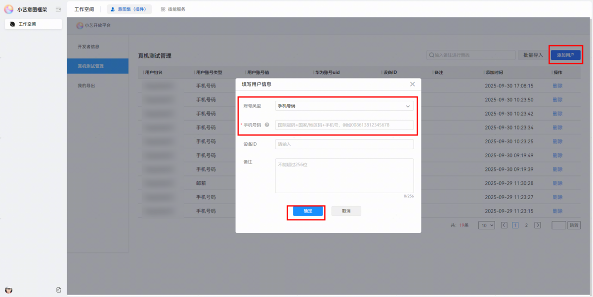 点击添加用户,选择账号类型为邮箱/手机号码,填入后点击确定(测试用户须为该项目团队下的成员)。