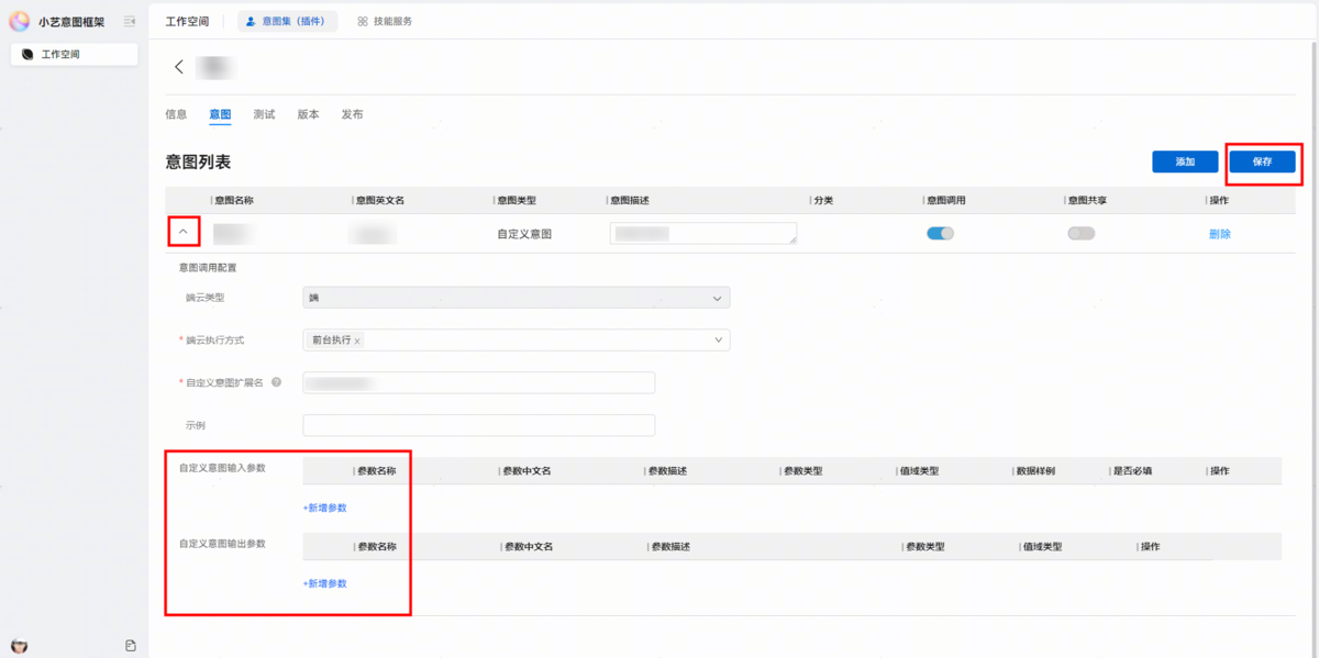 展开已创建的意图,并填入自定义输入、输出参数,点击保存。