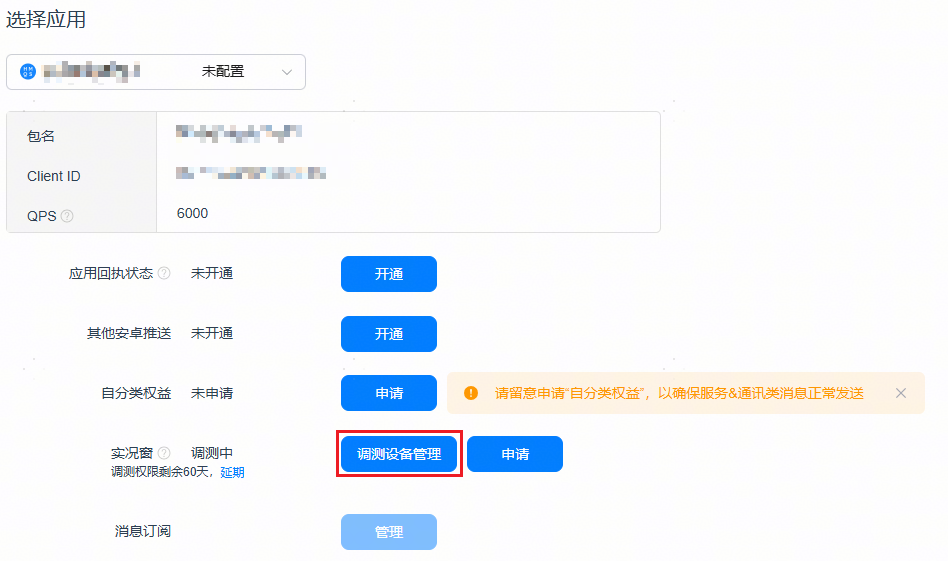 选择开发者的应用,点击实况窗-调测设备管理,根据Push Token添加调测设备后即可进行接入调测。