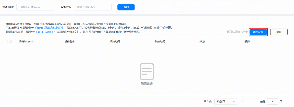- 调测设备管理需根据Push Token添加调测设备,每个应用可添加的设备上限为100。