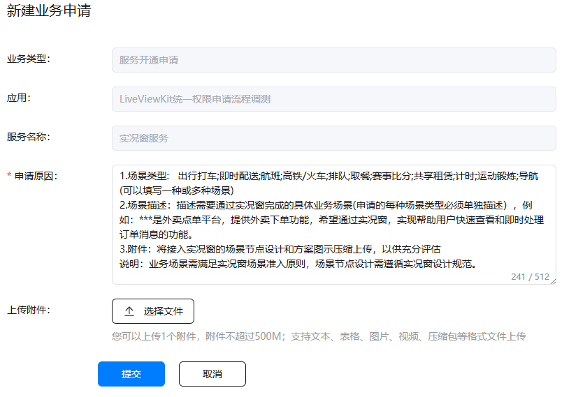 开发者可参考“申请原因”中的模板,提供申请必须的相关信息,包括场景类型、场景描述、附件,然后点击“提交”按钮。