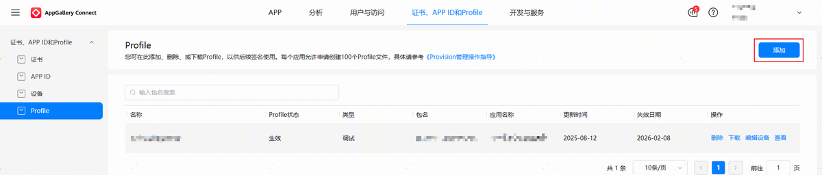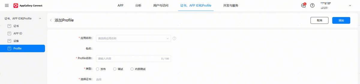 实况窗服务权限通过后,须在“证书、APP ID和Profile”页面下左侧树形菜单的“Profile”页签,点击“添加”重新生成Profile文件,并下载Profile文件到本地,然后在“发布应用”时,须将该Profile打包到应用包中。