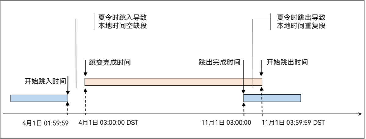 夏令时跳入将导致一段时间空缺,例如1:59:59跳转到3:00:00;夏令时跳出将导致一段时间重复,例如3:59:59回退到3:00:00。