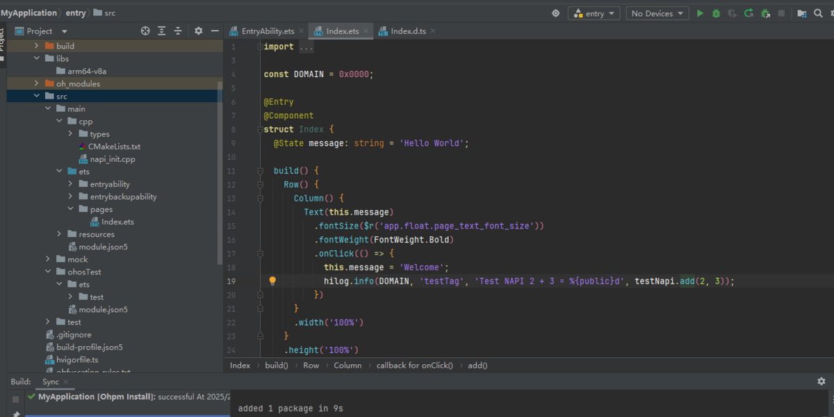 .onClick(() => {hilog.info(0x0000, 'testTag', 'Test NAPI 2 + 3 = %{public}d', testNapi.add(2, 3));})