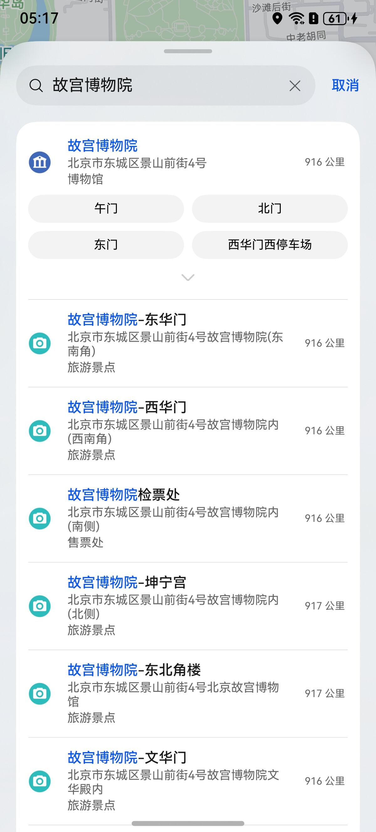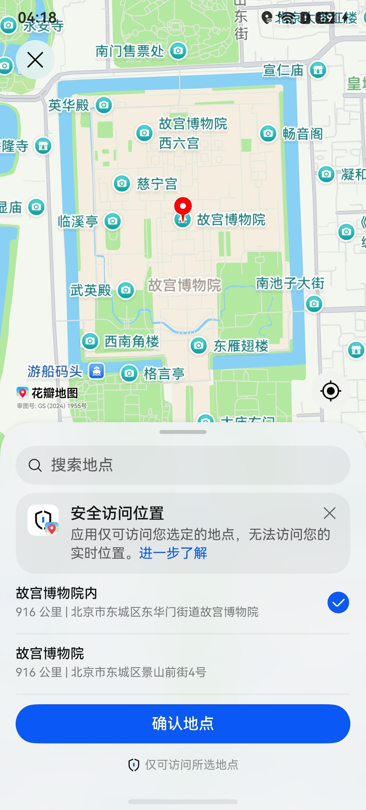 let locationChoosingOptions: sceneMap.LocationChoosingOptions = {// 地图中心点坐标location: {latitude: 39.91804051376904,longitude: 116.3970536796932},// 展示搜索控件searchEnabled: true,// 展示附近POIshowNearbyPoi: true};// 拉起地点选取页sceneMap.chooseLocation(this.getUIContext().getHostContext() as common.UIAbilityContext,locationChoosingOptions).then((data) => {console.info("ChooseLocation", "Succeeded in choosing location.");}).catch((err: BusinessError) => {console.error("ChooseLocation", `Failed to choose location, code: ${err.code}, message: ${err.message}`);});