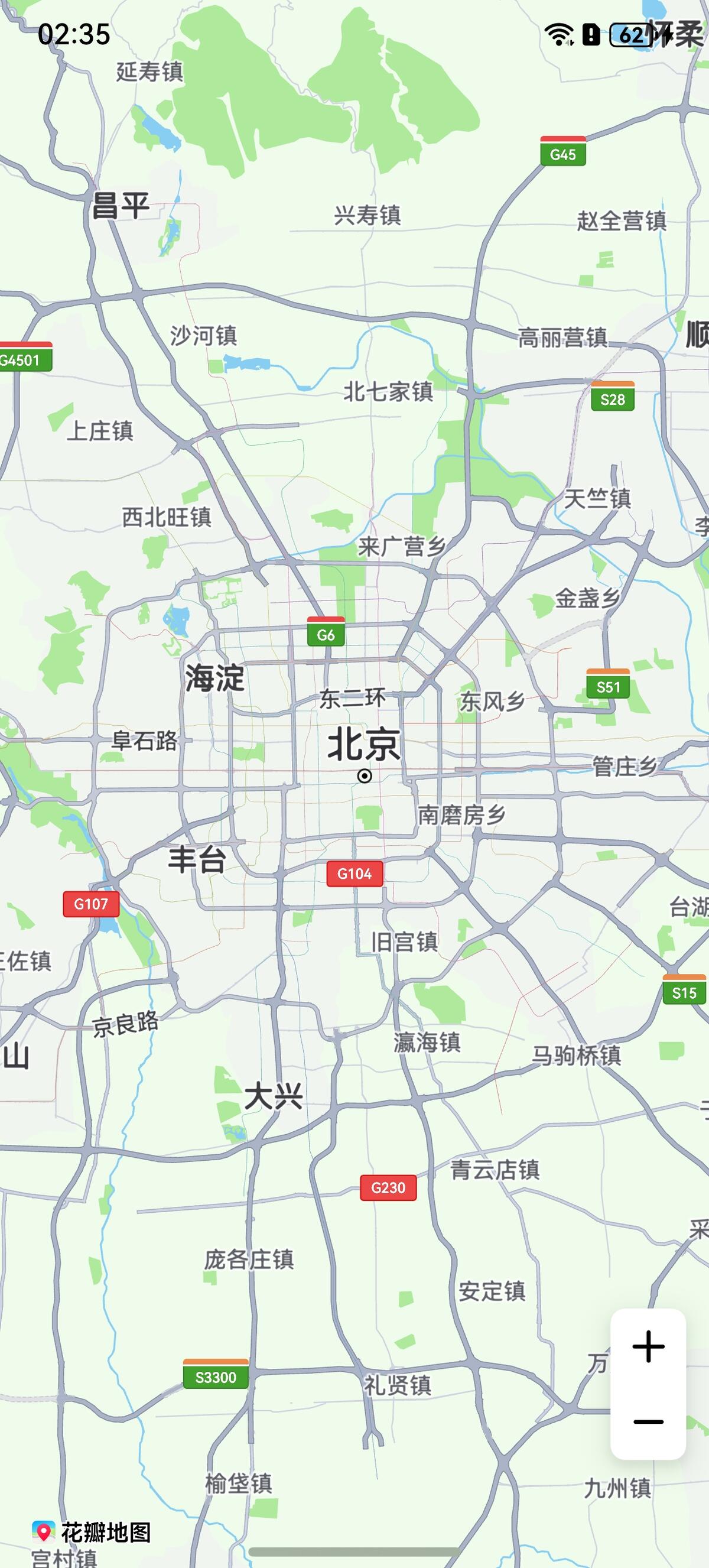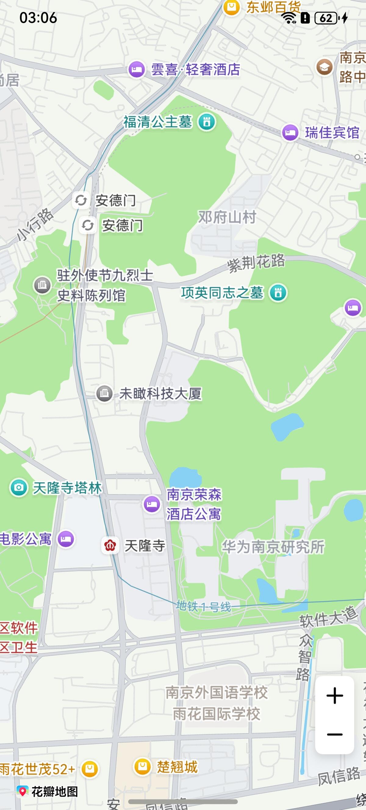 // 创建CameraUpdate对象let cameraPosition: mapCommon.CameraPosition = {target: {latitude: 32.0,longitude: 118.0},zoom: 10,tilt: 0,bearing: 0};let cameraUpdate = map.newCameraPosition(cameraPosition);// 以非动画方式移动地图相机this.mapController.moveCamera(cameraUpdate);// 以动画方式移动地图相机this.mapController.animateCamera(cameraUpdate, 1000);// 以动画方式移动地图相机,并返回动画结果let animateResult = await this.mapController.animateCameraStatus(cameraUpdate, 1000);图3 相机移动前