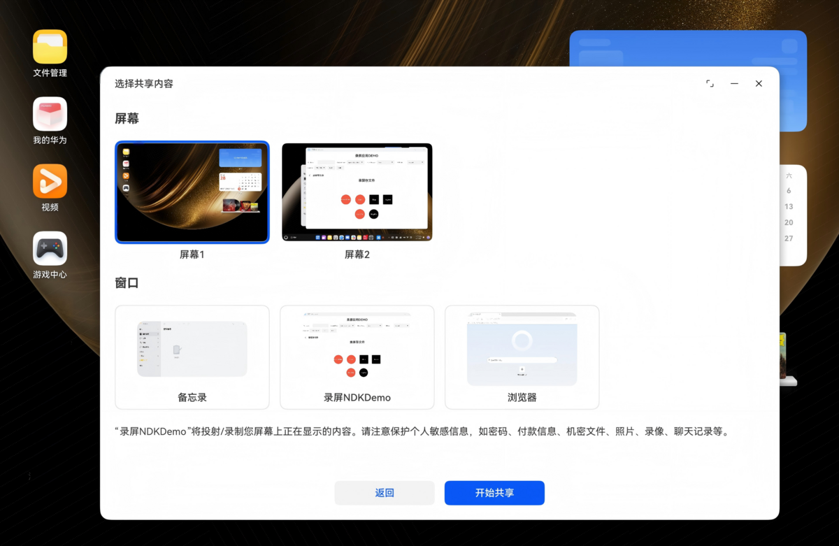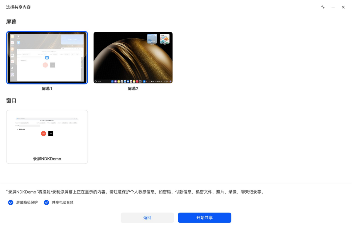 在此模式下,启动录屏后,PC/2in1设备会弹出选择共享内容弹窗,并默认选中videoCapInfo.displayId参数对应的屏幕,如果传入的displayId对应的窗口不存在,则不做任何选中。
