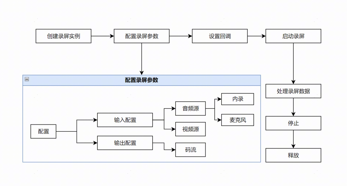 根据音视频采集的参数不同,会生成不同数据流,包含视频流、内录的音频流、麦克风录制的音频流,开发者可根据场景进行不同的处理,如将码流流转到其他模块,实现共享桌面、视频直播等。