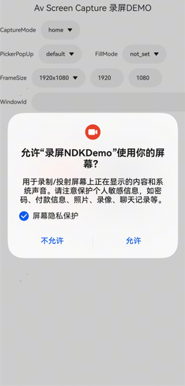 在此模式下,启动录屏后,PC/2in1设备不会弹出选择录屏内容弹窗,会弹出隐私保护弹窗,同时配置的videoCapInfo.displayId参数不会生效,默认生效主屏的displayId。