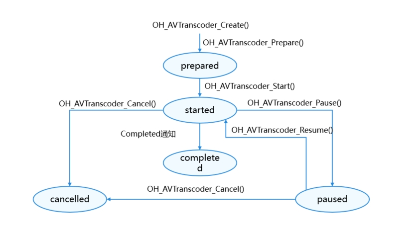 (可选)恢复转码:调用OH_AVTranscoder_Resume()成功之后重新进入AVTRANSCODER_STARTED状态。