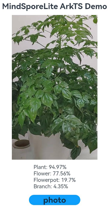 在设备上,点击photo按钮,选择相册中的一张图片,点击确定。在图片下方显示此图片占比前4的分类信息。