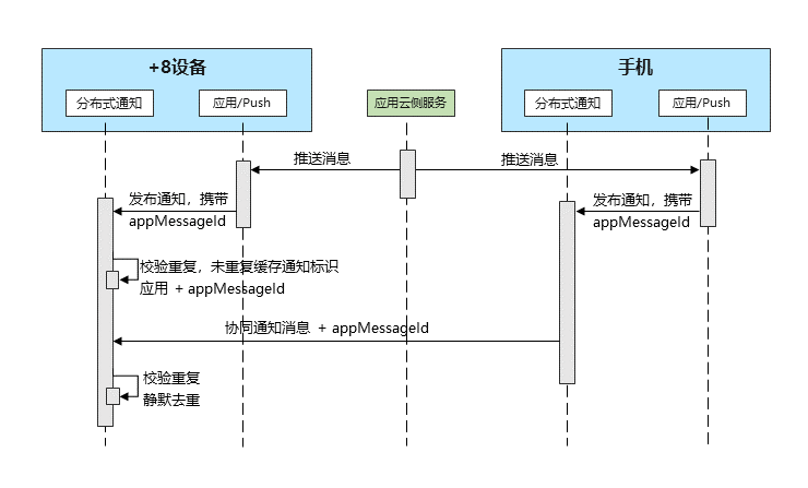 应用发送通知时携带唯一标识字段appMessageId,分布式通知接收到多渠道发布的通知后,会根据该字段进行判断,从而实现通知去重。