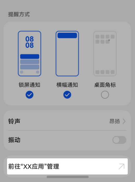 - 点击“前往XX应用管理”的选项,即可跳转至应用内对应的通知设置页面。