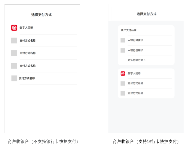 商户收银台展示数字人民币支付入口时,需与其他支付App在同一层级,建议不要隐藏数字人民币支付入口或满足一定条件后才在收银台页面展示。具体参考如下: