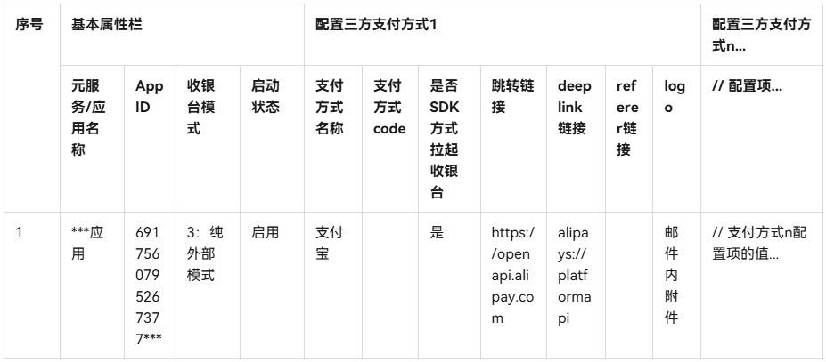 如接入混合支付、纯外部支付,开发者需与华为支付业务侧沟通(合作咨询可点击此处)后提供以下信息给华为支付业务侧添加支付模式相关配置,配置项内容参考如下: