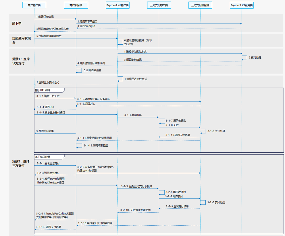 混合支付模式,收银台上用户可选择华为支付或三方支付方式支付。具体接入流程如下: