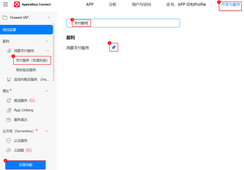 应用服务Payment Kit(鸿蒙支付服务)Payment Kit常见问题找不到“支付服务(非虚拟类)”菜单或AppID关联授权的页面怎么处理?找不到“支付服务(非虚拟类)”菜单或AppID关联授权的页面怎么处理? 登录AppGallery Connect网站选择对应的项目后,在‘全部功能’中搜索“鸿蒙支付服务”并固定到菜单导航栏中。在“支付服务(非虚拟类)> 待关联商户号”选择对应的商户点击“授权”即可。可参考下图所示: