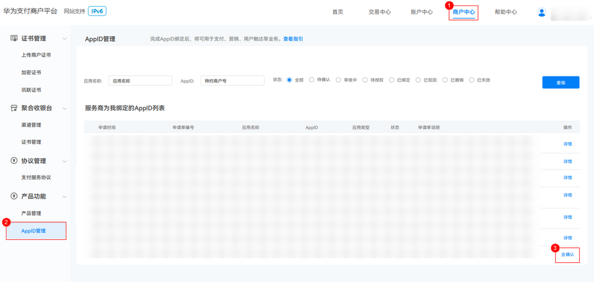 特约商户登录华为支付商户平台进入“商户中心 > 产品功能 > AppID管理”选择“服务商为我绑定的AppID列表”中的数据,点击去确认,对服务商邀请绑定AppID进行确认。