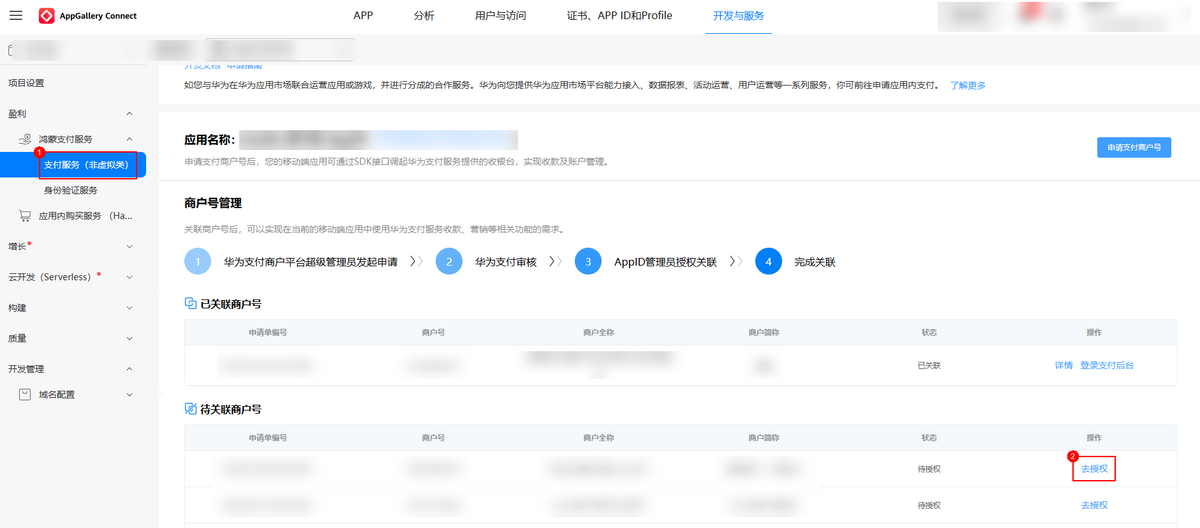 申请绑定AppID后,应用管理员登录AppGallery Connect网站选择对应的项目后,在左侧导航栏选择“盈利 > 鸿蒙支付服务(可在‘全部功能’中搜索服务并固定到导航栏)> 支付服务(非虚拟类)> 待关联商户号”选择对应的商户点击“授权”。