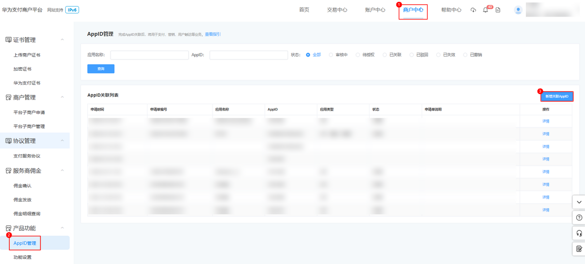 服务商登录华为支付商户平台进入“商户中心 > 产品功能 > AppID管理”,在“服务商绑定的AppID”页签内点击“新增关联AppID”。