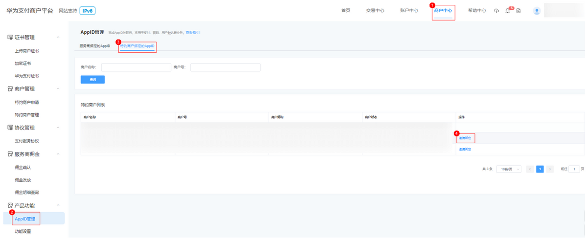 服务商登录华为支付商户平台进入“商户中心 > 产品功能 > AppID管理”,在“特约商户绑定的AppID”页签内根据服务商下的特约商户列表,选择特约商户发起AppID绑定申请邀请。