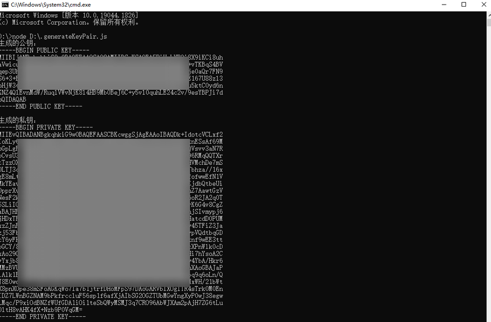 打开命令行工具,进入generateKeyPair.js所在目录,执行node generateKeyPair.js命令。