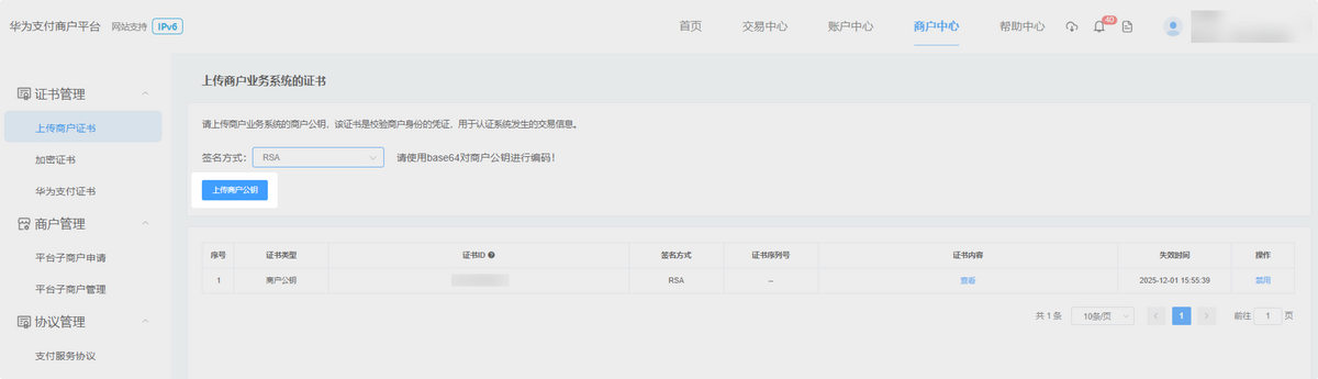 请登录华为支付商户平台,在“证书管理 > 上传商户证书”模块进行商户证书公钥上传。