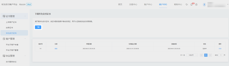 - 商户成功登录华为支付商户平台后,须在证书管理中上传商户证书,上传完商户证书后商户方可进行交易。证书必须与商户号相匹配且是有效的。