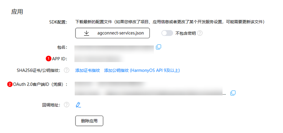 - 其中app_id的value值为应用的APP ID(在AppGallery Connect网站点击“开发与服务”,在项目列表中找到项目,在“项目设置 > 常规”页面的“应用”区域获取“APP ID”的值),详见下图的标号1处。