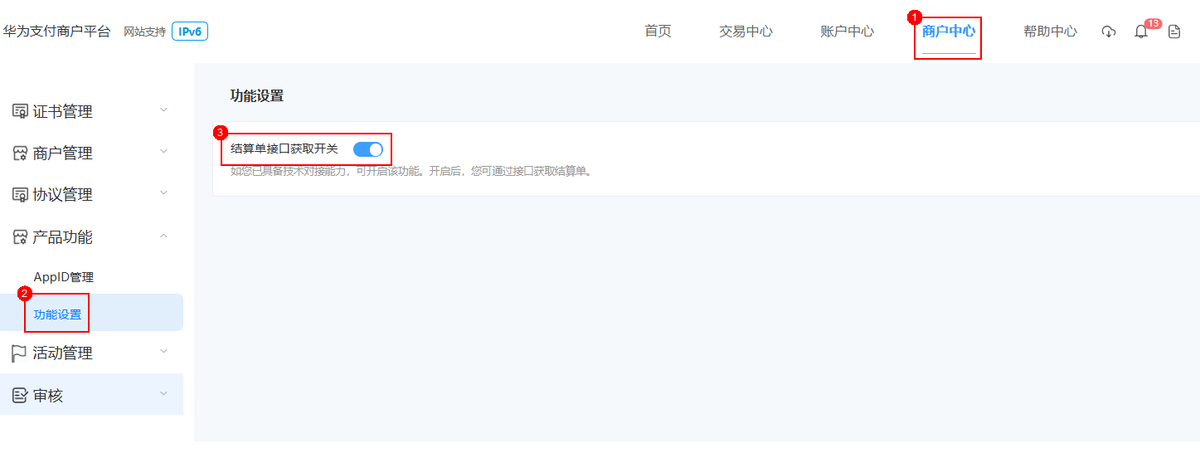 如需要生成及下载账单,需商户在华为支付商户平台入网时设置的管理员先在“华为支付商户平台 > 商户中心 > 产品功能 > 功能设置”中开启“账单接口获取开关”,开启后次日开始生成前一日的账单。
