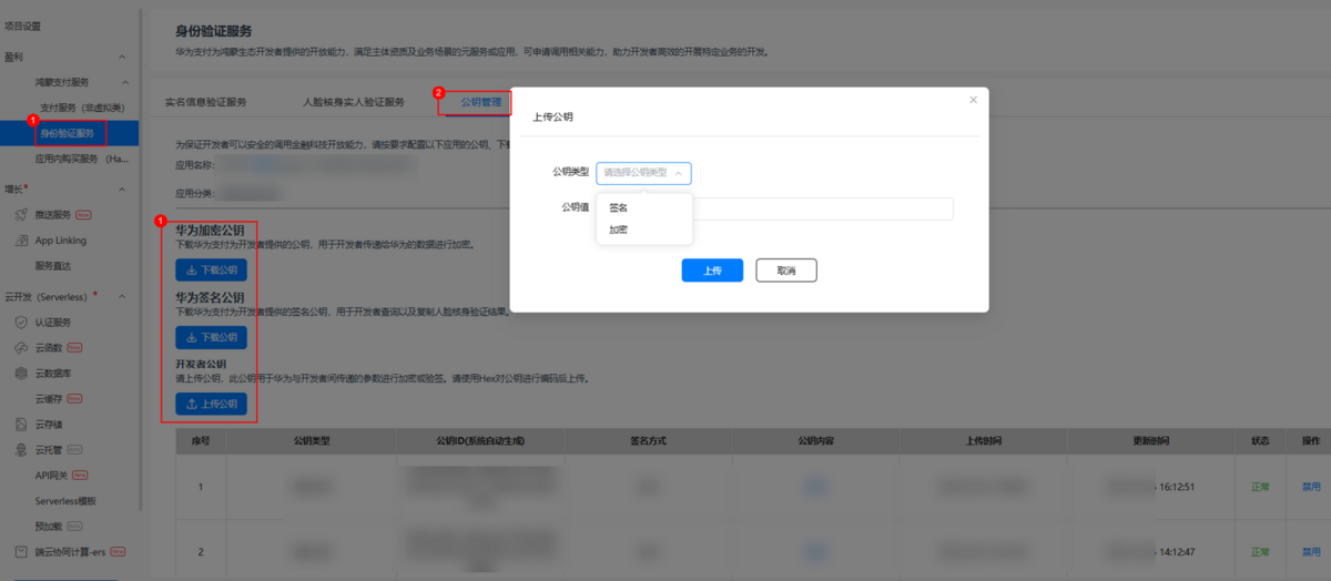 开发者可登录AppGallery Connect,在“鸿蒙支付服务 > 身份验证服务”菜单中的“公钥管理”页签下完成开发者证书的上传以及华为公钥证书下载。