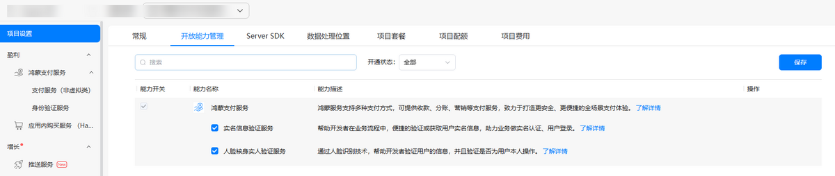 开发者可登录AppGallery Connect,在“项目设置 > 开放能力管理”的“鸿蒙支付服务”中开启身份验证服务相关权限开关。