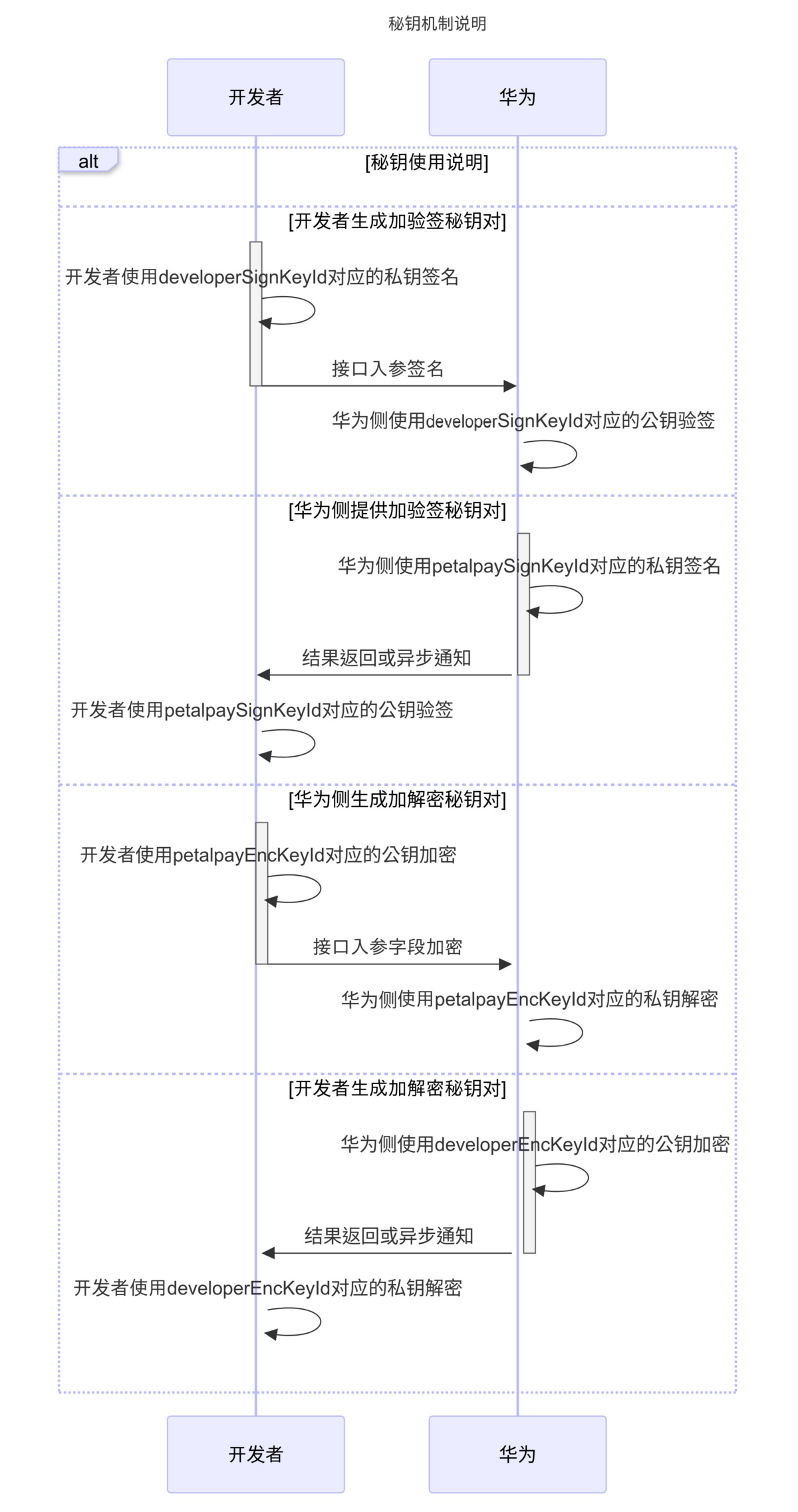 | 开发者公钥(加密) | 开发者生成 | 开发者使用SM2加密算法生成的证书公钥。需登录AppGallery Connect,在“鸿蒙支付服务>身份验证服务>公钥管理”上传(公钥类型为加密)。 使用场景: 开发者上传后生成证书Id(developerEncKeyId),开发者请求开放API接口时可通过PayDevAuth请求头传递,指定给华为支付服务器用于对开放API接口响应的隐私字段加密。 |