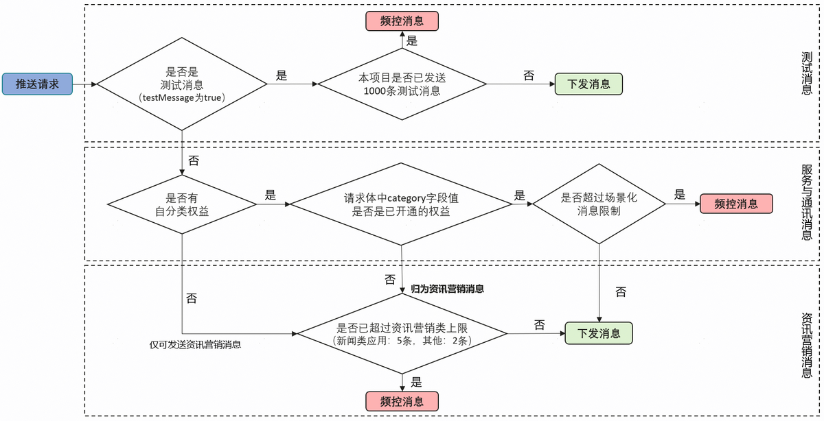 调测阶段,每个项目每个自然日最多可推送1000条测试消息(非设备级,所有设备共用1000条),且不受场景化消息频控限制(即不区分通知消息类别、不区分场景化消息类别)。发送测试消息需设置testMessage为true。