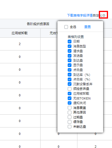 点击自定义后的,可自定义推送消息报表展示的表格列,默认展示的表格列有:日期、消息类型、请求量、发送量、到达量、显示量、点击量、到达率(%)、点击率(%)、沉默设备丢弃、应用被卸载、无效TOKEN、通知关闭。全选可展示全部表格列,重置则恢复默认表格列。