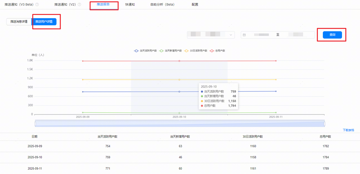 您可以查看推送用户的详情,根据时间维度查看活跃用户、新增用户和总用户的统计数据。