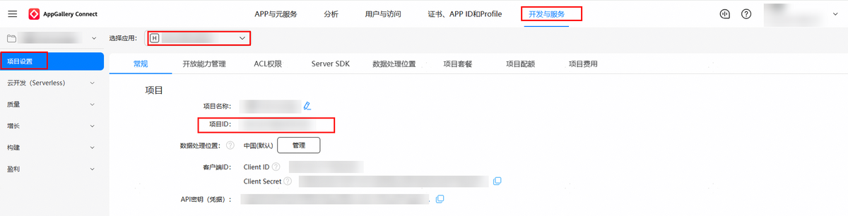 您的应用所属项目ID查看方法:登录AppGallery Connect网站,选择“开发与服务”,在项目列表中选择对应的项目,左侧导航栏选择“项目设置”,在该页面获取。