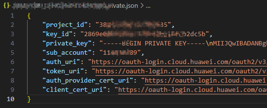 {"project_id": "*****","key_id": "*****","private_key": "-----BEGIN PRIVATE KEY-----\nMIIJQgIBADANBgkqhkiG9w0BAQEFAASCCSwwggkoAgEAAoICAQCKw6kJKtCh7qmMvp1u1dI27z2TKZrPOzHbQaXO/Eez0AWZ2EN+ouF496R3pfo7fQXC1XOT/YTbVC4DNZwWSMA54fu3/AOCY9Zzyi46OK*****==\n-----END PRIVATE KEY-----\n","sub_account": "*****","auth_uri": "https://oauth-login.cloud.huawei.com/oauth2/v3/authorize","token_uri": "https://oauth-login.cloud.huawei.com/oauth2/v3/token","auth_provider_cert_uri": "https://oauth-login.cloud.huawei.com/oauth2/v3/certs","client_cert_uri": "https://oauth-login.cloud.huawei.com/oauth2/v3/x509?client_id="} -