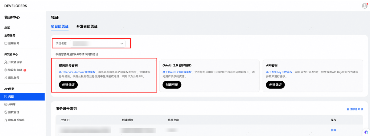 您需要在华为开发者联盟的API Console上创建并下载推送服务API的服务账号密钥文件,凭证创建入口如下图所示,选择所在项目,创建“服务账号密钥“凭证。相关创建步骤请参见API服务操作指南-服务账号密钥。