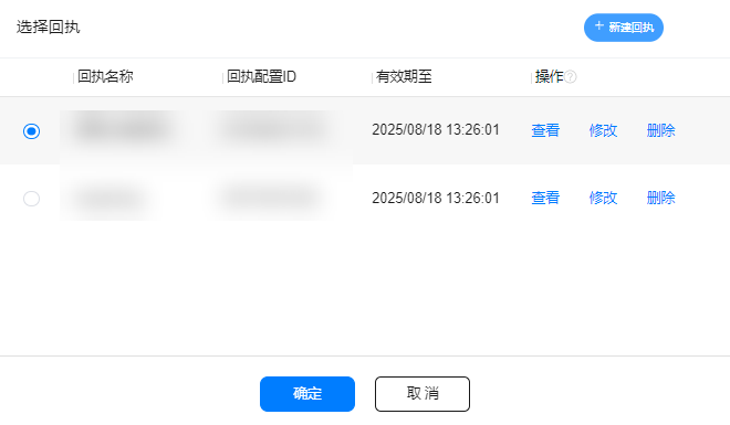 进入回执参数配置,可以选择已有回执或者新建回执。