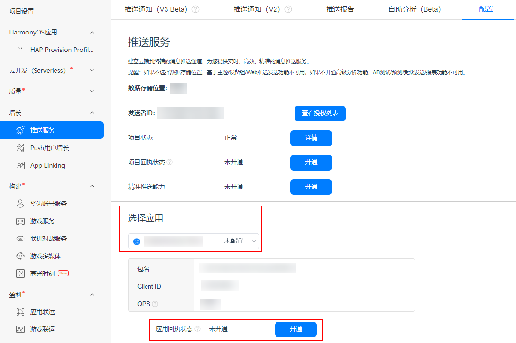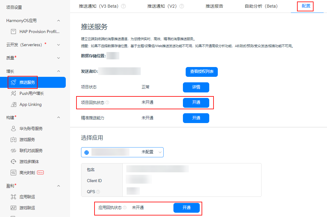 在项目列表中找到您的项目,通过“增长 > 推送服务 > 配置”导航到“配置”页签。在该页面可以选择配置项目级回执或者应用级回执,需要注意的是项目级回执消息接收URL地址,对该项目下所有应用生效。如果您同时配置了项目级回执和应用级回执地址,则优先获取应用级回执地址信息。