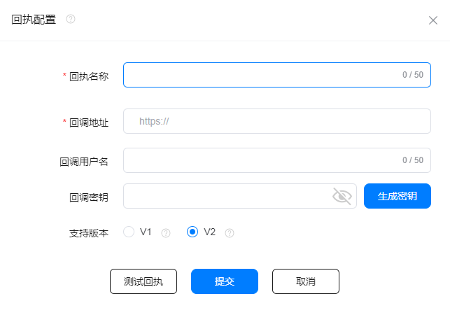 “测试回执”可以对回执地址进行功能测试,点击“提交”完成回执的创建。