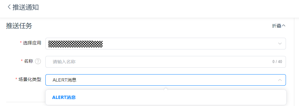字段值 说明 选择应用 消息发送的目标应用,此字段为必填字段。 名称 用于在管理台中标识通知,此名称不会给用户显示,此字段为必填字段。 场景化类型 场景化消息类型,当前仅支持Alert消息。 -