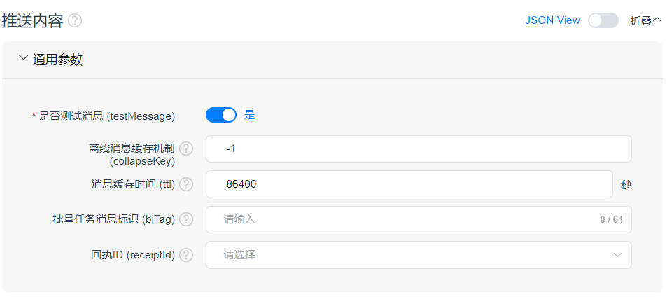 字段值 说明 是否测试消息 (testMessage) 测试消息标识,对应场景化接口中的testMessage参数,此字段为必填字段。 测试消息标识: false:正式消息 true:测试消息 (默认值) 离线消息缓存机制 (collapseKey) 离线消息缓存控制方式,,对应场景化接口中的collapseKey参数,此字段为可选字段。 离线消息缓存控制方式,取值范围-1 100。 -1:对所有离线消息都缓存(默认值) ; 0100:离线消息缓存分组标识,对离线消息进行分组缓存,每个应用每一组只缓存一条最新的离线消息。消息缓存时间 (ttl) 对应场景化接口中的ttl参数,此字段为可选字段。 消息缓存时间,单位是秒。在用户设备离线时,消息在Push服务器进行缓存,在消息缓存时间内用户设备上线,消息会下发,超过缓存时间后消息会丢弃,默认值为86400秒(1天) ,最大值为15天。 批量任务消息标识 (biTag) 对应场景化接口中的biTag参数,此字段为可选字段。 批量任务消息标识,消息回执时会返回给应用服务器,长度最大64字节。 回执ID (receiptId) 对应场景化接口中的receiptId参数,此字段为可选字段。 回执ID指定本次下行消息的回执地址及配置。该回执ID可以在配置回执参数中查看。 -