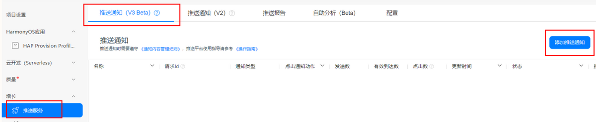 在项目列表中找到您的项目,通过“增长 > 推送服务 > 推送通知(V3 Beta)”导航到“推送通知(V3 Beta)”页签。在该页签下点击“添加推送通知”新建推送任务。