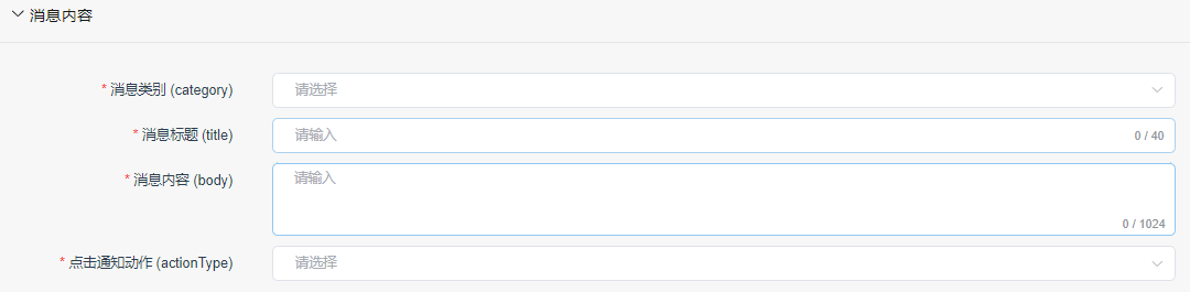 字段值 说明 消息类别 (category) 对应场景化接口中的category参数,此字段为必填字段。 通知消息类别。完成申请通知消息自分类权益后,用于标识消息类型,不同的通知消息类型影响消息展示和提醒方式。取值如下: · 即时聊天:IM · 音视频通话:VOIP · 订阅:SUBSCRIPTION · 出行:TRAVEL · 健康:HEALTH · 工作事项提醒:WORK · 账号动态:ACCOUNT · 订单&物流:EXPRESS · 财务:FINANCE · 设备提醒:DEVICE_REMINDER · 邮件:MAIL · 新闻、内容推荐、社交动态、产品促销、财经动态、生活资讯、调研、功能推荐、运营活动(仅对内容进行标识,不会加快消息发送),统称为资讯营销类消息:MARKETING · PLAY_VOICE:语音播报 消息标题 (title) 对应场景化接口中的title参数,此字段为必填字段。 通知消息标题。 消息内容 (body) 对应场景化接口中的body参数,此字段为必填字段。 通知消息内容。 点击通知动作 (actionType) 对应场景化接口中的clickAction中actionType参数,此字段为必填字段。 点击消息后触发的动作,可选择打开应用首页、自定义action页面或自定义intentUri页面。