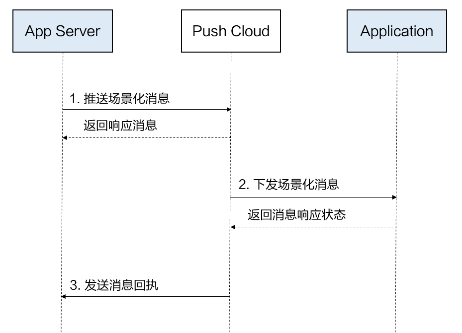 - 应用服务端向华为Push Kit云侧推送场景化消息,发送后应用服务端将收到云侧返回的响应消息。